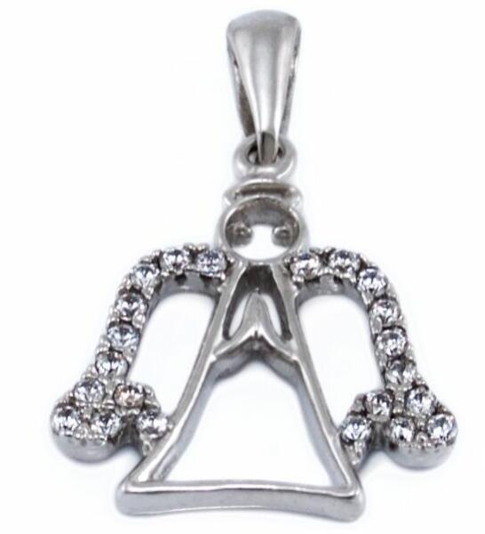 Csillogó cirkónia kövekkel ékített angyal körvonalat ábrázoló, ródiummal bevont arany medál.