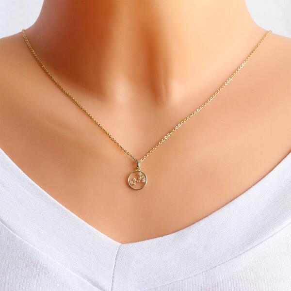 Kör alakú medál sárga 14K aranyból. A körön belül a "Skorpió" csillagkép található. A csillagkép keskeny arany színű részekből áll, amelyeket apró tartókba foglalt kis átlátszó cirkóniák egészítenek ki. A medál felülete sima és erősen fényes. A láncra kerülő szeme ovális alakú. A medál átmérője: 10,5 mmA medál súlya: 0,64 gA kapocs szélessége: 2 mm Fém