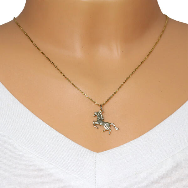 Arany medál részletesen kidolgozott ló alakban tükörfényű testtel, miközben az állat a hátsó lábain álló testhelyzetben van megörökítve. A medál méretei: 22 x 15 mmA medál súlya: 0,46 gA láncon lévő szem szélessége: 2,5 mmFémjelzéssel ellátott. Medál lánc nélkül.