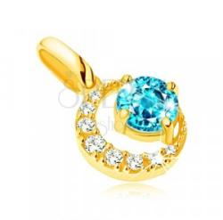 Medál 14K sárga aranyból, vékony félhold alakban, kerek, átlátszó cirkóniákkal kirakva és egy csiszolt, kerek topázból, amely a félhold két csúcsa között helyezkedik el és négy vékony, fényes karommal van odaerősítve. A láncra kerülő szem hosszúkás, fényes és sima. A medál méretei: 9 x 9 mmA medál súlya: 0,7 gA láncra kerülő szem szélessége: 1,5 mmFémjelzé