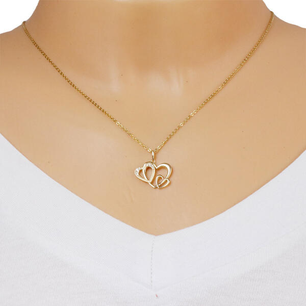 A 375 sárga arany medál három összekapcsolt szívből áll, kettőnek sima és fényes a felülete. Az egyik szívet bemetszések és átlátszó cirkóniák díszítik. A láncra kerülő szem keskeny és felfelé szélesedik. A medál mérete: 18 x 15 mmA láncra kerülő szem szélessége: 1,5 mmA medál súlya: 0,97 gFémjelzéssel ellátva. Medál lánc nélkül.