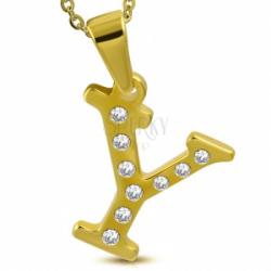 Az arany árnyalatú, sebészeti acél medál fényes, sima felületű és nagy, nyomtatott "Y" betű alakú. A betűt kerek, átlátszó cirkóniák díszítik, amelyek csiszolt, csillogó felületűek. A láncra kerülő szem hosszúkás alakú. Medál méretei: 17 x 18 mmLáncra kerülő szem szélessége: 3 mmMedál lánc nélkül.