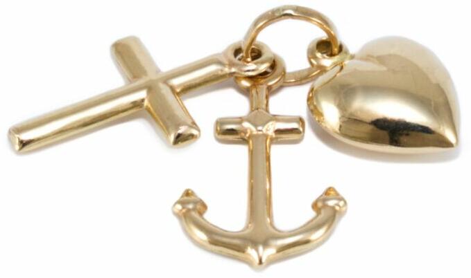 Klasszikus és kedvelt fazonú, üreges kialakítású, mutatós, szív-kereszt-horgony arany medál.