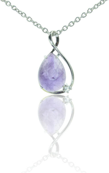 Strasszal díszített természetes ametiszt köves medál, "végtelen" jel foglalatban, 45cm-es orvosi acél nyakláncon. Ásvány mérete: 14*18mm Az ametiszt vélt gyógyhatása