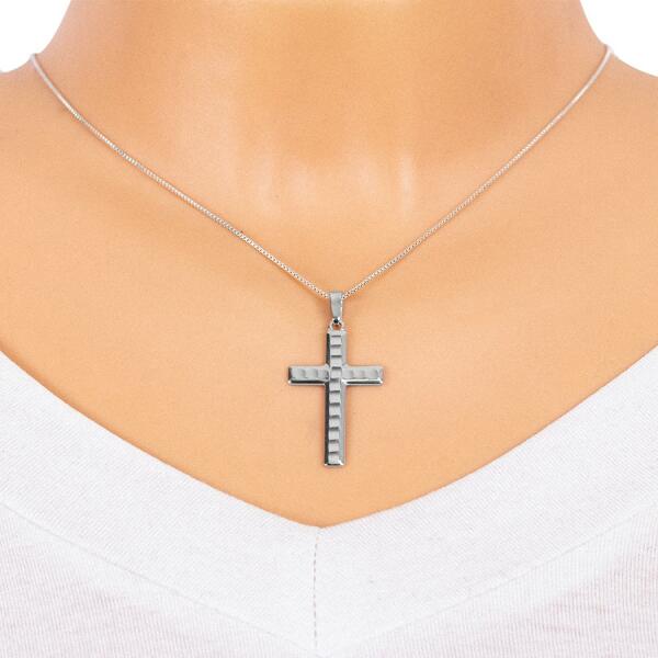 Kereszt alakú medál ezüstből. A függő első oldala finoman keskenyedik, felületét szabályos vésetek díszítik. A fény játékának köszönhetően a vésetek beágyazott fényes kövek hatását keltik. A függő hátoldala sima. A függő mérete: 20 x 33 mmA láncra kerülő szem szélessége: 4 mmA medál lánc nélkül kapható. A medál súlya: 2,5 gFémjelzéssel ellátott.