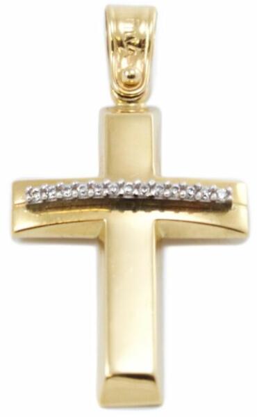 Modern stílusú, üreges ám igen masszív, cirkónia kősorral ékített, sárga arany kereszt medál.
