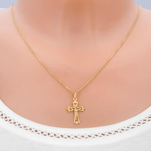 Medál sárga aranyból, kereszt szélesedő tagolt szárakkal. A szárak végei három rövid nyúlványra tagolódnak. A felszíne fényes, keskeny bevágásokkal, melyek a közepétől kifelé húzódnak. A közepén háromdimenziós Jézus alak található táblával és INRI felirattal. A medál méretei: 18 x 27 mmA medál súlya: 0,7 gA láncon lévő szem szélessége: 3 mmFémjelzéssel e