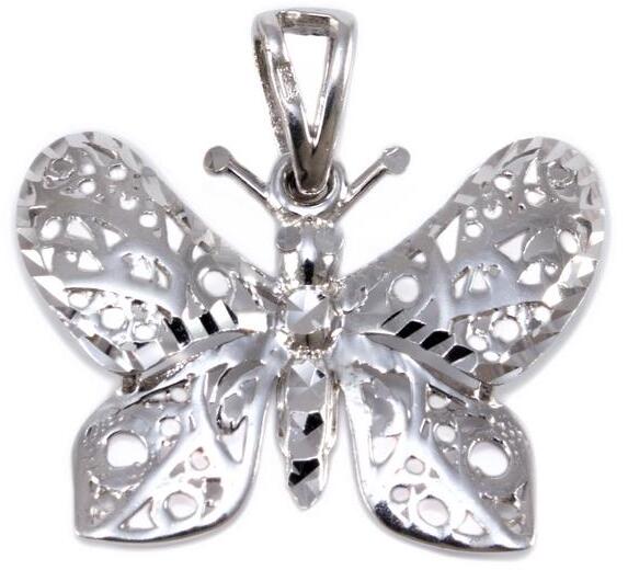 Modern stílusú, kedvelt fazonú, ródiummal bevont, áttört, véséssel díszített, mutatós lepke fehárarany medál.