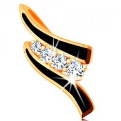 A 14K sárga arany medál két fekete fénymázzal díszített sávból áll, amelyek között egy csillogó, átlátszó cirkóniás sáv helyezkedik el. A láncra kerülő szem a medál hátoldalán található. Medál méretei: 6 x 15 mmMedál súlya: 0,4 gA láncra kerülő szem szélessége: 2 mmFémjelzéssel ellátott. Medál lánc nélkül.