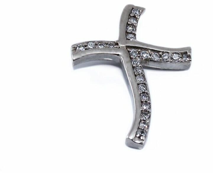 Modern stílusú, kedvelt fazonú, ródiummal bevont, fehér cirkónia kövekkel díszített, futó arany kereszt medál.