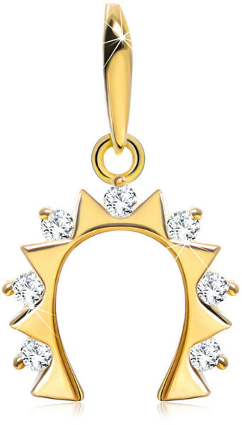 Medál 585 sárga aranyból kis szerencsét hozó patkó alakban. A felszíne fényes és sima, miközben a teljes külső kerületén háromszög alakú bevágások találhatóak. Mindegyikben kerek átlátszó cirkóniák vannak. A láncra kerülő szem keskeny és hosszúkás alakú. Medál mérete: 9 x 9 mmMedál súlya: 0,4 gA láncra kerülő szem szélessége: 1,5 mmFémjelzéssel ellátott