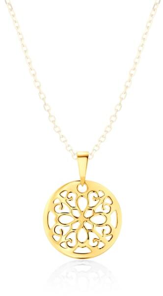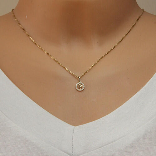 A 375 arany medál kör alakú, amelybe egy terebélyes, fényes és sima felületű fa van helyezve. A kört apró átlátszó cirkóniák díszítik. A láncra kerülő szem hosszúkás alakú és felfelé szélesedik. A medál átmérője: 8 mmA láncra kerülő szem szélessége: 1,5 mmA medál súlya: 0,2 gFémjelzéssel ellátva. Medál lánc nélkül.