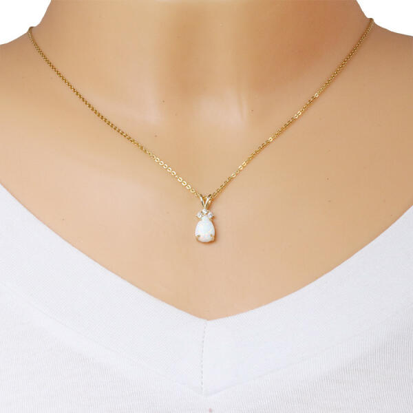 A 9K sárga arany medál egy csepp alakú szintetikus opálból áll. A könnycsepp egy négykarmos foglalatba van helyezve. A felső része három átlátszó cirkóniával van kirakva. A nem mozgatható láncra kerülő szem a medál részét képezi és két fokozatosan szélesedő hurokból áll. A medál mérete: 7 x 19 mmA láncra kerülő szem mérete: 2 mmA medál súlya: 0,57 gFémjelzés
