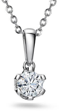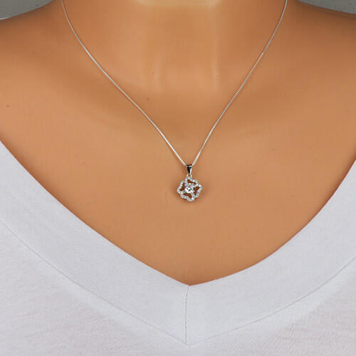 A 925 ezüst medál felülete ródiummal kezelt és virág alakú, amelynek sziromkörvonalai apró csillogó cirkóniákkal vannak kirakva. A szirmok lapos szív alakúak. A virág közepét egy kerek, csiszolt, átlátszó cirkónia díszíti. A láncra kerülő szem fényes és sima, felfelé szélesedik. A medál mérete: 11 x 11 mmA láncra kerülő szem szélessége: 3 mm A medál súlya: 1,