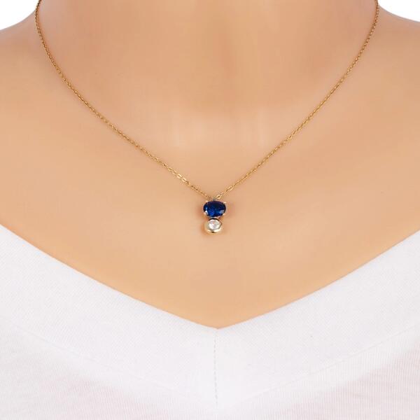 A 375 sárga arany medált egy nagyobb ovális, vágott , sötétkék színű, cirkónia díszíti, amely négy sima foggal ellátott tartóba van foglalva. Alatta egy kisebb kerek, átlátszó, csiszolt cirkónia van rögzítve. Ez utóbbi fényes és enyhén domború tartóba van foglalva. A medál, felfelé kiszélesedő láncra kerülő szemmel rendelkezik. Medál mérete: 8 x 12 mm Medál sú