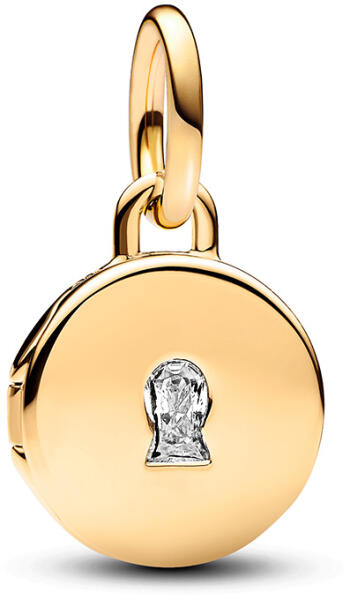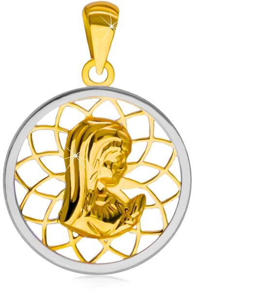 A ródiummal kezelt felületű 585 arany medált egy fényes kör körvonala alkotja, amelynek belsejét virágmotívum díszíti. A közepében az imádkozó Szűz Mária képe található. A láncra kerülő szem keskeny és felfelé szélesedik. A kör átmérője: 16 mmA láncra kerülő szem szélessége: 2,5 mmA medál súlya: 0,80 gFémjelzéssel ellátva. Medál lánc nélkül. A ródiumma