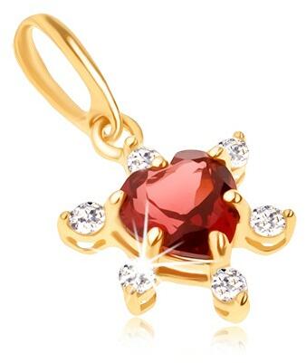 375 arany medál, egyenletes szív alakban csillogó kiemelkedésekkel, amelyek belseje egy csiszolt szívecskés gránáttal díszített piros színben. A kiemelkedések átlátszó cirkóniákból állnak. A láncszem hosszúkás alakú, fényes és sima. A medál méretei: 9 x 9 mmA medál súlya: 0,4 gA láncra kerülő szem szélessége: 1,5 mmFémjelzéssel ellátott. Medál lánc nélkül.