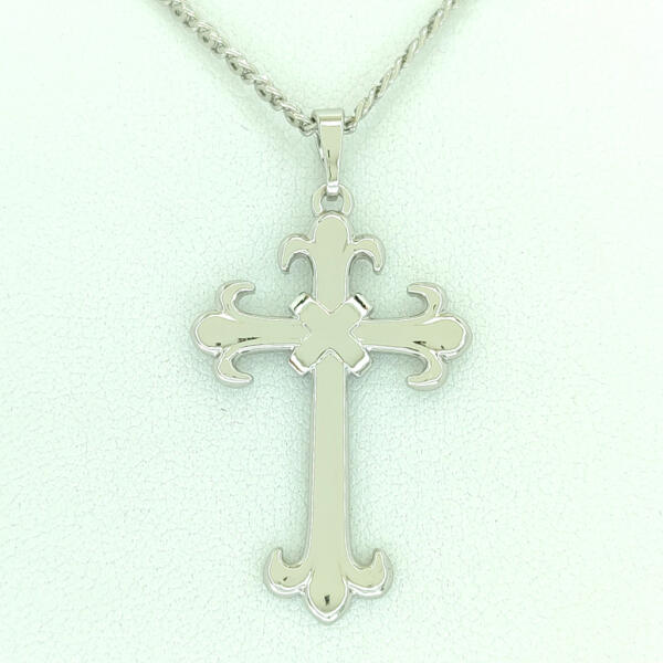 Ezüstszínű kereszt medál. Időtálló ékszer, víz hatására sem feketedik. . Antiallergén ékszer. Medál mérete: 22 mm x 32 mm. A különböző hosszúságú medálok mintázata esetenként eltérhet a képen láthatótól, szélességük 2 mm vagy 3 mm. Az antiallergén ékszerek olyan fémötvözetből készülnek, melyek nem irritálják a bőrt, nem okoznak allergiás reakciókat, ez