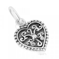 925 ezüst medál, szív alakzat. A medál széle vágatokkal díszített, középen egy virág alakzat és egy golyó található. A medál hátsó része sima, fényes. A láncra kerülő szem ovális. Medál méretei: 8 x 11 mmLáncra kerülő szem szélessége: 1,5 mmSúly: 0,6 gFémjelzéssel ellátott. Medál lánc nélkül.