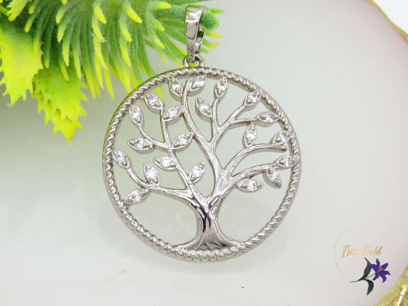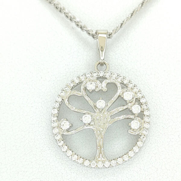Ezüstszínű életfa motívummal díszített kerek medál. A csillogásról fehér cirkónia kristályok gondoskodnak. A kristályok karmos foglalatban helyezkednek el. Időtálló ékszer, víz hatására nem feketedik. Antiallergén ékszer. Medál átmérője: 22 mm. A különböző hosszúságú nyakláncok mintázata eltérhet a képen láthatótól, szélességük 2 mm vagy 3 mm. Az antiall
