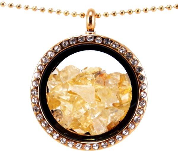 Nagyon sejtelmes, kicsit kaleidoszkópos medálkát készítettem ezekből az aprócska citrin ásványokból. A két üveglap közt mozgolódó kristályok mindig más mintázatot mutatnak. A medálka nyitható, de a zárat a biztonság kedvéért rögzítettem. A medál egyik oldala körbe csillogó kristályokkal van díszítve, a másik fele sima. A medál és a hozzávaló nyaklánc színe le