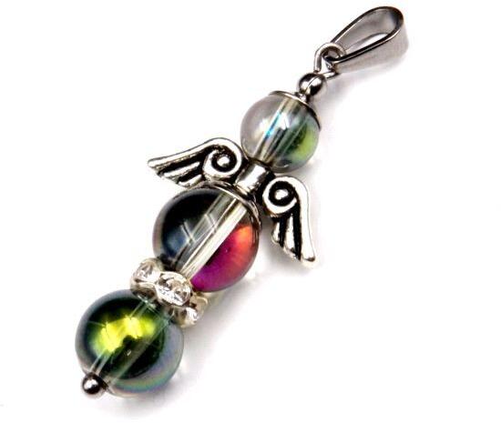 Szivárvány aura kvarc angyal medál. A medálkákat 6-8mm-es kerek gyöngyökből, tibeti ezüst és nemesacél alkatrészek felhasználásával készítettem. Az aura kvarcok mesterségesen előállított kristályok. Ettől nem kell megijednünk, mert hatása így kombinált lesz, a felhasznált elemek mindegyike jótékony hatással lesz szervezetünkre. A szivárvány aura kvarcra hegyikrist