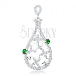 Könnycsepp alakú 925 ezüst medál, amelynek a kontúrja két smaragdzöld cirkóniával van kiegészítve. A körvonal belsejében dekoratív virágok és kerek, átlátszó árnyalatú cirkóniák találhatók. A láncszem fordított könnycsepp formájú. A medál méretei (láncszemmel): 18 x 39 mmA láncra kerülő szem szélessége: 2 mmA medál súlya: 3,8 gFémjelzéssel ellátott. Medá