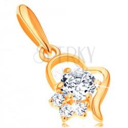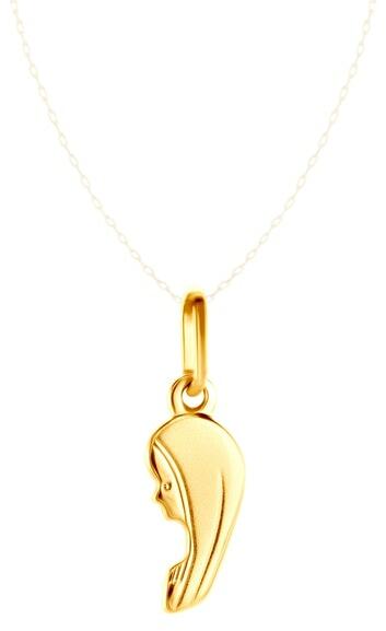 A 14K sárga arany medál egy aszimmetrikus szív körvonalat ábrázol, amelynek sima és fényes a felülete. A medál alsó részén a körvonal megszakított és beültetett, kerek, átlátszó cirkóniákkal van díszítve - egy nagy és három kis cirkóniával. A láncra kerülő szem hosszúkás és sima fényes a felülete. Medál méretei: 8 x 10 mmMedál súlya: 0,5 gA láncra kerülő