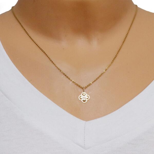 A 14K sárga arany medál egy virágot ábrázol, amelyet három különböző típusú szirmok alkotnak. A legnagyobb szirmok sima és fényes felületű körvonalak. A kisebb szirmok felülete tükörfényes és sima, amelyek búzaszem alakú, kerek átlátszó cirkóniákkal díszített szirmokkal váltakoznak. A virág közepében egy kerek átlátszó cirkónia helyezkedik el egy foglalatba