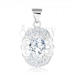 Medál 925 ezüstből ovális, átlátszó, csiszolt cirónia alakban, amely mindkét oldalán három ezüst, félhold alakú vonal húzódik kivágásokkal amelyek a pillangó szárnyaira emlékeztetnek. A cirkóniás pillangó kettős kerettel van körbefogva apró kövekből. A medál felülete ródiummal kezelt. A medál méretei: 12,5 x 14 mmA medál súlya: 2,2 gA láncra kerülő szem szél