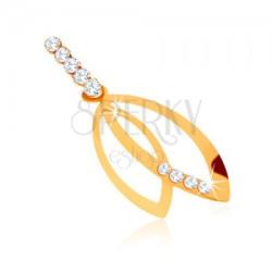 Fényes 9K medál sárga aranyból két egymásba fonódott kisebb és nagyobb szemecske körvonalból. A láncra kerülő szemet és a nagyobbik szemecskét átlátszó kerek cirkóniák díszítik. A medál felszíne ródiumozott. A medál méretei: 8 x 19 mm A medál súlya: 0,1 g A láncra kerülő sze szélessége: 1 mmFémjelzéssel ellátott. Medál lánc nélkül. A ródiummal kezelt felü