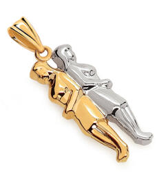 Arany háromdimenziós Ikrek jel medál 14 karátos sárga és fehér aranyból az Ikrek jegyben. Az arany felülete fényes. Igény esetén szívesen ajánlunk megfelelő láncot, vedd fel velünk a kapcsolatot...