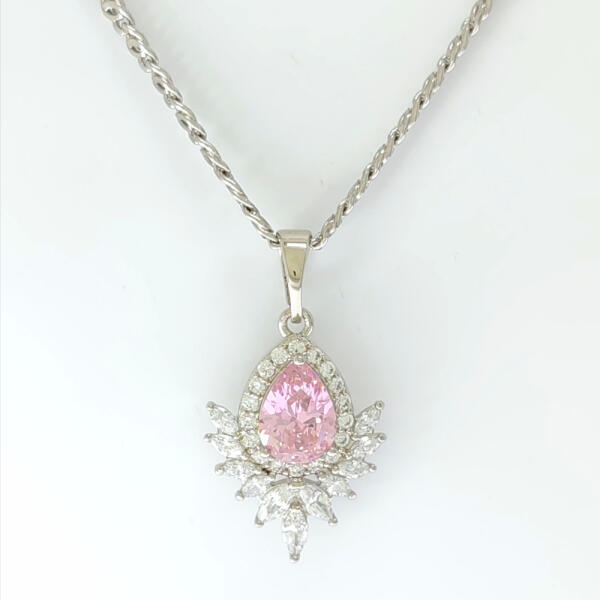 Ezüstszínű, csillogó rózsaszín és fehér cirkónia kristállyal díszített medál. A kristályok karmos foglalatban helyezkednek el. Időtálló ékszer, víz hatására sem feketedik. Antiallergén ékszer. Medál mérete: 14 mm x 18 mm. A különböző hosszúságú medálok mintázata esetenként eltérhet a képen láthatótól, szélességük 2 mm vagy 3 mm. Az antiallergén ékszerek