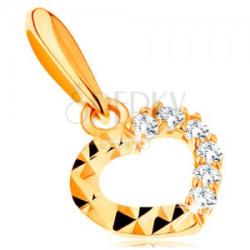 585 sárga arany medál, fénylő szabályos szív körvonal. Az egyik fele gyémánt metszetes a másik pedig, cirkóniákkal van kirakva. A láncra kerülő szem hosszúkás és fényes. Medál mérete: 7 x 7 mmSúly: 0,3 gLáncra kerülő szem: 1,5 mmFémjelzéssel ellátott. Medál lánc nélkül.