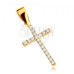 Medál 9K sárga aranyból kis latin kereszt alakban, mely gazdagon díszített kerek átlátszó cirkóniákkal. A láncra kerülő szem hosszúkás és felfelé haladva enyhén szélesedik. A medál méretei: 8 x 15 mmMedál súlya: 0,2 g Láncra kerülő szem szélessége: 2 mmFémjelzéssel ellátott. Medál lánc nélkül.