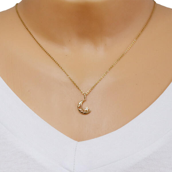 9K sárga arany gyémánt medál, amelyet egy hold díszít, díszesen faragott „LOVE (szeretet) felirattal. A felirat „o betűje helyett egy szív van. A hold alsó végén van egy ötágú csillag, amely tiszta briliánssall és fényes vonallal rendelkezik. A lánckapocs keskeny, hosszúkás alakú és a teteje felé kiszélesedik. Medál mérete: 10 x 14 mmA kapocs szélessége: 1,5 mmMed