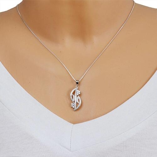 A ródiummal kezelt felületű 925 ezüst medál csillogó körvonal alakú, amelyet hosszúkás levelek alkotnak. Két átlátszó cirkóniás virág van a szárhoz illesztve. A virágot kerek szirmok alkotják. A láncra kerülő szem sima és fényes, felfelé szélesedik. A medál mérete: 11 x 28 mmA láncra kerülő szem szélessége: 3 mmA medál súlya: 2,17 gFémjelzéssel ellátva. Medá