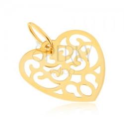 Medál 14K sárga aranyból lapos szabályos szívből sima tükörfényű felszínnel, mely belseje kivágott mintával díszített. A medál méretei:14 x 14 mm A medál súlya: 0,30 gA láncon lévő szem szélessége: 2 mmFémjelzéssel ellátott. Medál lánc nélkül.