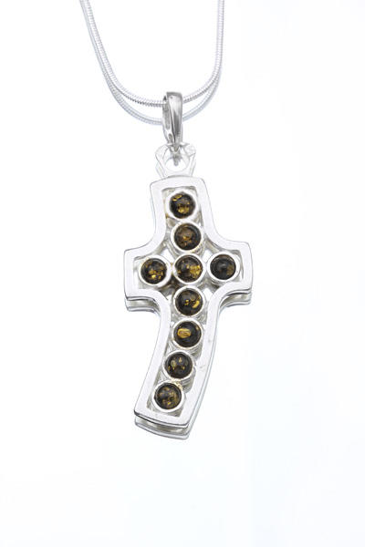 925 tisztaságú ezüst kereszt medál valódi borostyán kővel Súly: 7,0gr Méret: 55x20 mm Kő: 9 db 4 mm-es borostyán Borostyán: A borostyán egy, kb. 40 millió éves gyantásodott fosszília, mely egy máig ismeretlen tűlevelű fafajtához kötődik. A borostyán kis keménységű és alacsony a hővezető-képessége. Titokzatos elektrosztatikus vonzása és éghetősége miatt a kezdet
