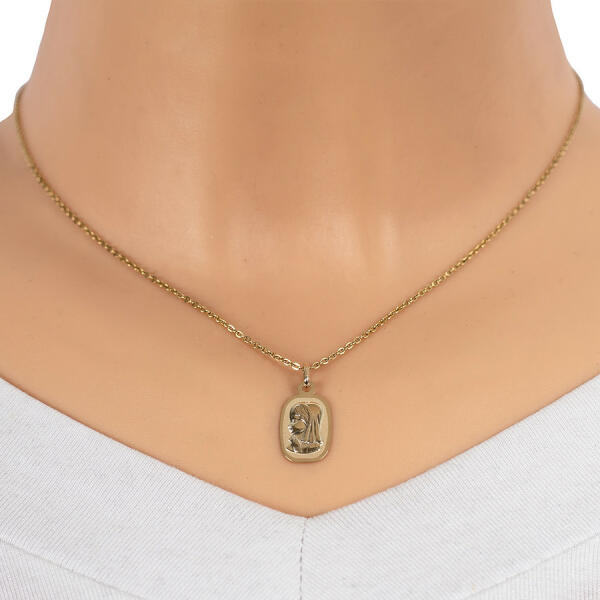 Medál 9K sárga aranyból matt téglalap alakú tábla alakban lekerekített élekkel, amelyen Szűz Mária van ábrázolva fényes kivitelezésben precízen gravírozott részletekkel. A medálon fényes keret húzódik és a hátsó oldala matt és sima. A láncra kerülő szem ovális. A medál méretei: 10 x 14 mmA medál súlya: 0,54 gA láncra kerülő szem szélessége: 2,5 mmFémjelzésse