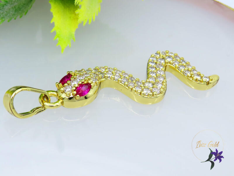 Gold Filled kígyót ábrázoló medál Gazdagon díszített kígyó medál piros szemekkel Szin: 14K Méret: 40x10mm A forgalmazott divatékszerek alapanyaga nikkel és ólommentes ezért többnyire nem okoznak allergiás tüneteket, nyugodtan hordhatják fémérzékeny emberek is. Általában nem színezik a bőrt és más divatékszerekhez képest nagyságrendekkel jobb kopásállósággal rend