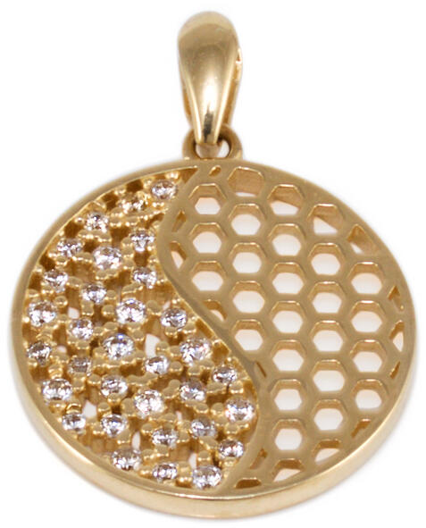 Modern stílusú, áttört mintával, valamint cirkónia kövekkel ékített kör alakú arany medál.
