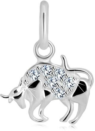 A 925 ezüst medál bika alakú. A bika háta átlátszó kerek cirkóniákkal van kirakva. A farka "S" betű alakú és felfelé ívelt. A medál hátulja lapos. A medál felülete fényes. A láncra kerülő szem ovális alakú. A medál mérete: 13 x 11 mmA láncra kerülő szem szélessége: 2,5 mmA medál súlya: 0,74 gFémjelzéssel ellátva. Medál lánc nélkül.