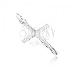 Medál fehéraranyból kereszt alakban hosszított szárral. A felszíne bevágott kis háromszög alakú táblákkal díszített, melyek folyamatos összekapcsolása fényes sugarakat alkot. A medál méretei: 10 x 19 mmA medál súlya: 0,32 gA láncon lévő szem szélessége: 3 mmFémjelzéssel ellátott. Medál lánc nélkül.