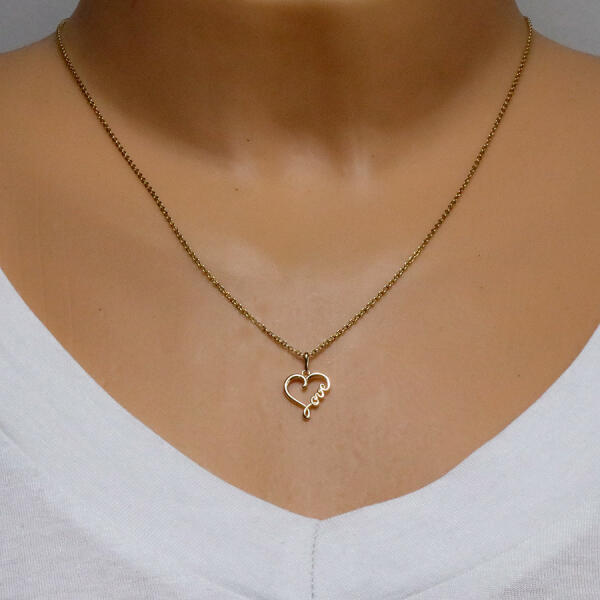 A 14K sárga arany medál aszimmetrikus szív alakú. A jobb oldalán található vonalban egy "Love" - "Szerelem" felirat található, amely folytatódik a szív bal oldalának vonalában. A kontúr fényes és sima. A láncra kerülő szem hosszúkás, felfelé szélesedik. A medál mérete: 11 x 13 mmA láncra kerülő szem szélessége: 1,5 mmA medál súlya: 0,5 gFémjelzéssel ellátva. Med