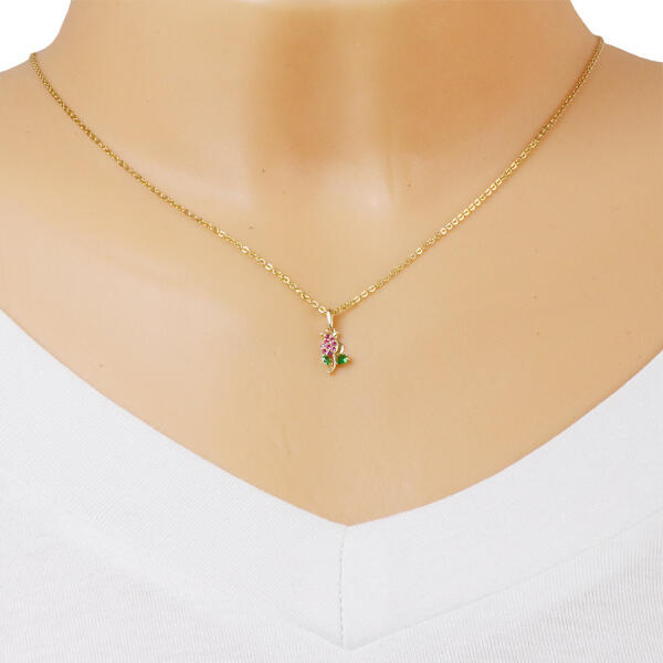 A 9K arany medál tulipán formájú, amelynek egyik oldalán egy sima, fényes szirom, másik oldalán egy rózsaszín cirkóniákkal kirakott szirom található. A szára sima, két zöld, levél alakú cirkónia díszíti. A láncra kerülő szem hosszúkás és felfelé szélesedik. A medál mérete: 6 x 11 mmA láncra kerülő szem szélessége: 1,5 mmA medál súlya: 0,31 gFémjelzéssel ell