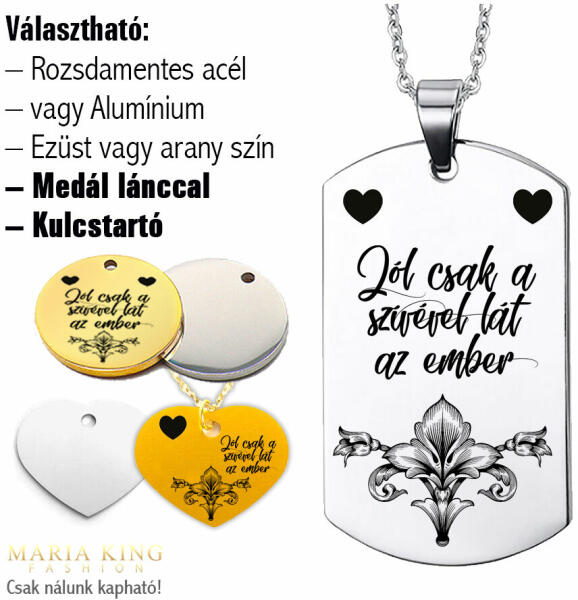 Ez az egyedi medál dizájn csak nálunk kapható. A legjobb gesztus és ajándékötlet! Választható rozsdamentes alumínium medál, vagy nemesacél tükörpolírozott kivitel is, arany vagy ezüst színekben. Az alapár az alumínium medálra vonatkozik lánccal vagy kulcstartóval együtt (válassz a listából, vagy rendeléskor írd be a MEGJEGYZÉSBE, hogy mire szereljük fel a medált, é