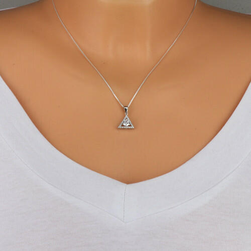 A ródiummal kezelt 925 ezüst medált egy háromszög körvonal díszíti, amelynek oldalai csillogó cirkóniákkal vannak kirakva. A háromszög közepébe egy kerek, átlátszó cirkónia van helyezve, amelyet három karom fog. A láncra kerülő szem fényes és sima, felfelé szélesedik. A medál mérete: 13 x 13 mmA láncra kerülő szem szélessége: 3 mm A medál súlya: 1,7 gFémjelzés