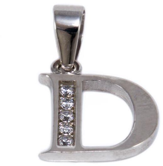 Kedvelt fazonú, cirkónia kősorral ékített, ródiummal bevont "D" betű arany medál.