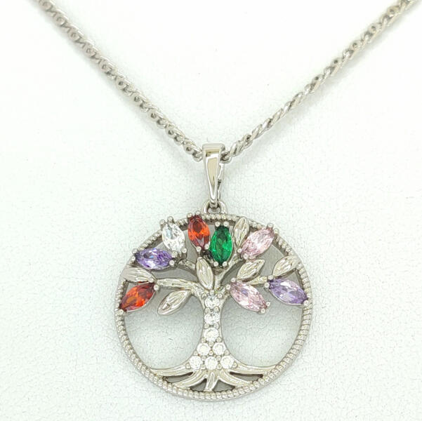 Ezüstszínű, csillogó színes cirkónia kristállyal díszített életfa medál. A kristályok karmos foglalatban helyezkednek el. Időtálló ékszer, víz hatására nem feketedik. Antiallergén ékszer. Medál átmérője: 22 mm. A nyakláncok különböző méretben kérhetők, ezek mintája esetleg eltérhet a képen láthatótól, szélessége 2 mm vagy 3 mm. Az antiallergén ékszerek ol